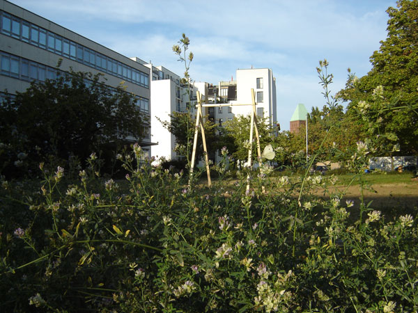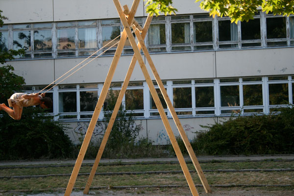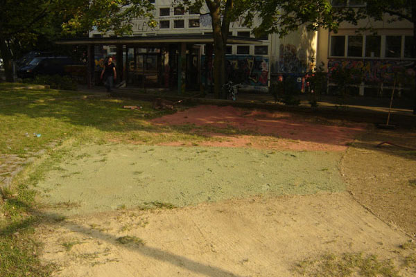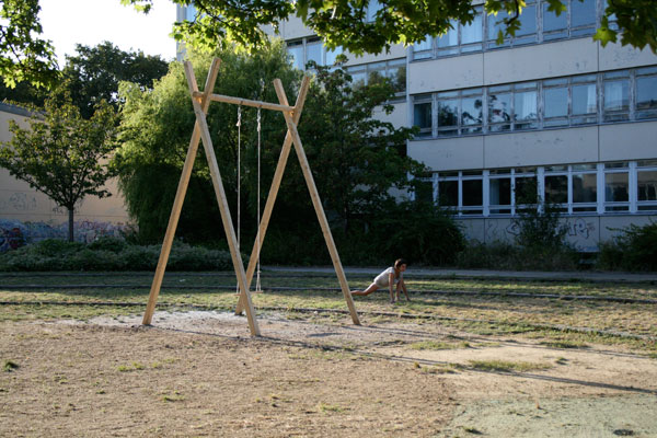 Drop the Landscape in the Sky was a project created during an artistic residency at Hotel 25 in Berlin. The studio provided by the residency program was located at Theaterhaus Mitte. In the same block of buildings, there was a high school, and both entities shared an open space. In front of the school, there was a semicircular courtyard, which was chosen as the site for installing a swing. The swing was part of the installation and performance Drop the Landscape in the Sky and was positioned over an area of pigmented sand created by Ana Rita, where the actions took place and remained available for use by both the artistic and school communities. The boundaries of colours were blurred by the contamination of sand dispersed through movement, seen through the lens of swinging person. This is an interactive piece where the sense of vision plays an important role, capable of dropping the sky into the landscape and the landscape into the sky, opening new perspectives on colours and boundaries..